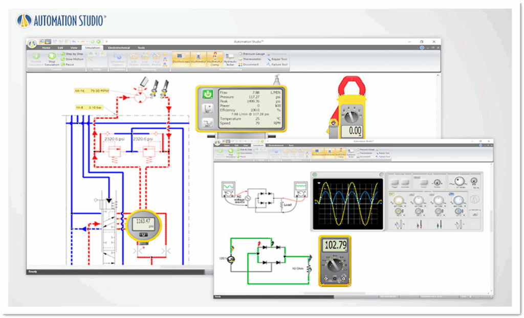 シミュレーション中に、オシロスコープ、マルチメータ、クランプメータ、油圧テスター、圧力計、温度計などの測定器を利用して、実回路での測定を擬似的に実習できます。