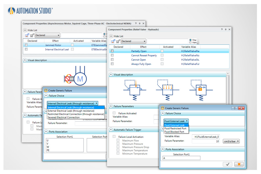 コンポーネントの故障を事前定義させる機能があり(油圧、空気圧、電気回路分野に限定)、測定値や挙動の異変から故障箇所を特定するようなシナリオを組むことができます。