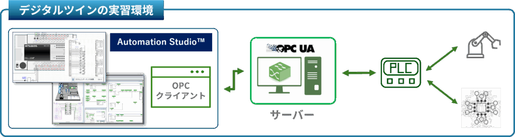 - OPC UA機能を介して、実機コントローラ(PLCなど)と通信して、Cyber-Physical環境を作れます(下図参照)。